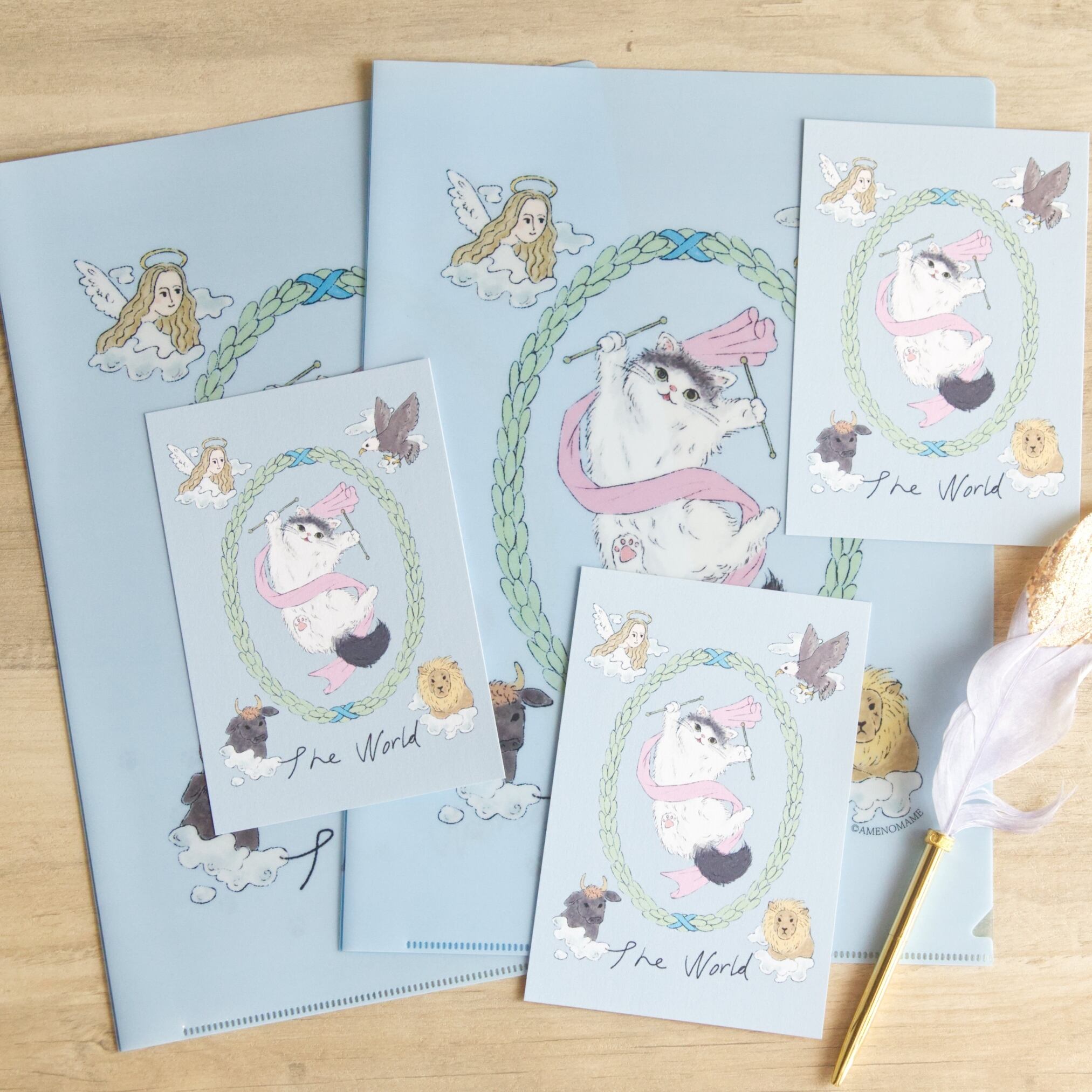 ちょっと短足な猫ちゃんがタロットの「世界」の絵柄を全力で表現したイラストのかわいいクリアファイル。